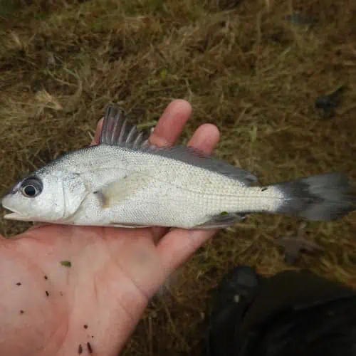 Green sunfish have bluish-green bodies covered in green or yellow reflections and a whitish belly. These fish also have a yellow and green mottled head, a black ear flap, and yellow edges on their fins. This species typically reaches around 3 – 7 inches in length and will rarely weigh over a pound. Green sunfish have very large mouths for panfish, and they use this mouth to eat aquatic insects, crustaceans, and smaller fishes.