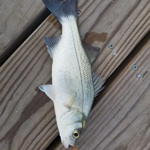 White bass are a mid-sized fish, and they average about 12 – 14 inches in length and weigh around two pounds. This species is highly aggressive when it comes to feeding, and schools of white bass will hunt together for items such as gizzard shad, perch, carp, and other fish species.